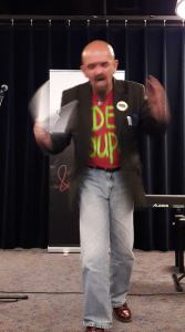 Zijn woorden lijken constant op te borrelen als een creatieve vulkaan die telkens opnieuw uitbarst. Soms valt zijn woordlava te sturen, meestal niet, zijn performance is onontkoombaar, zijn voordracht is fysiek en komt als bij donderslag.
