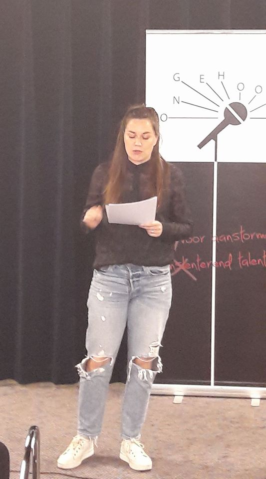 Bijna breekbaar begint Eline haar voordracht met persoonlijke overpeinzingen die steeds krachtiger worden. Zij groeit in haar woorden en neemt je mee in haar verhalen.